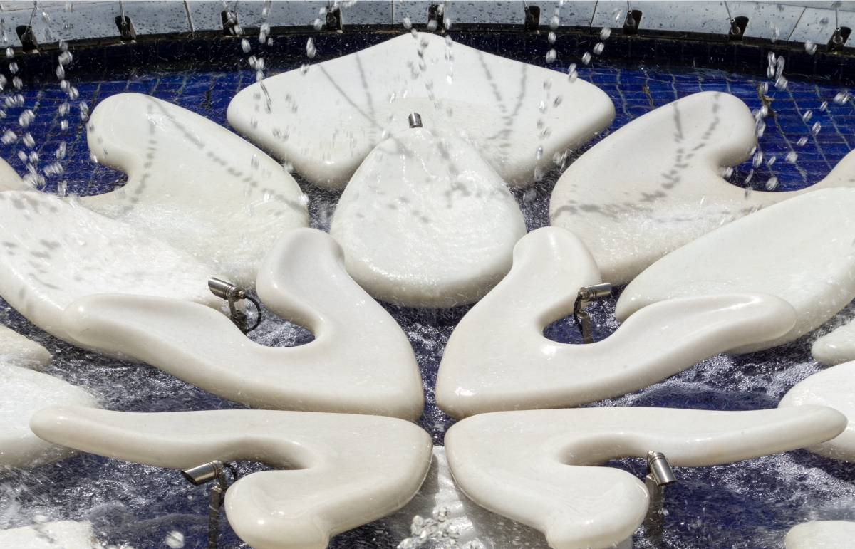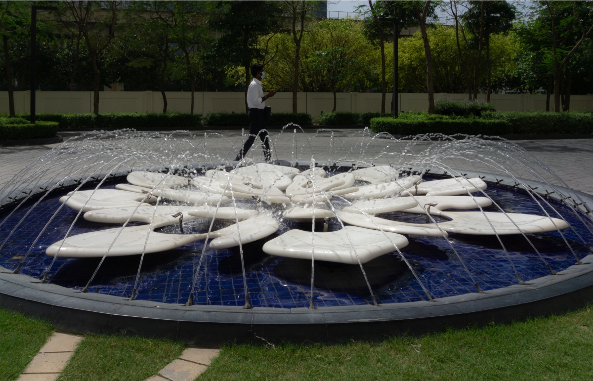 We conceptualize sculptural water features in natural stone or marble, ensuring that they age gracefully and never look incomplete, even when the water features are not maintained regularly. This waterbody at The DLF Camellias, in Gurgaon, not only enhances the landscape, but the sound adds a therapeutic environment to the surroundings. The waterbody is inspired by the flower Camellia, and carved in Indian White Marble placed strategically at different angles to create a multi-tiered visual experience.