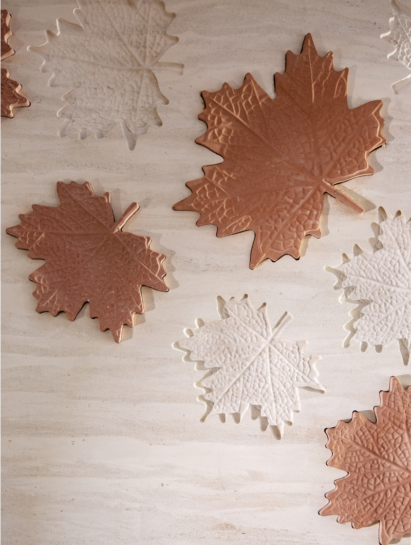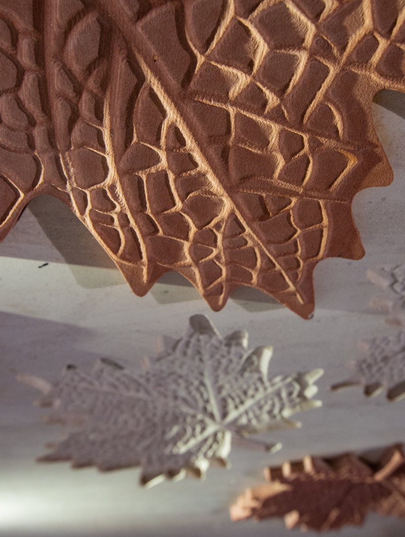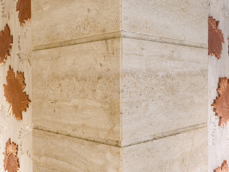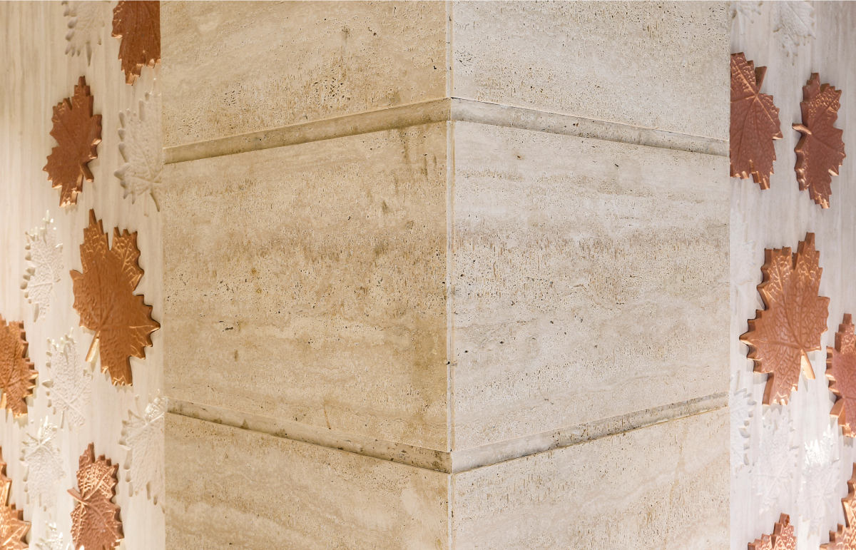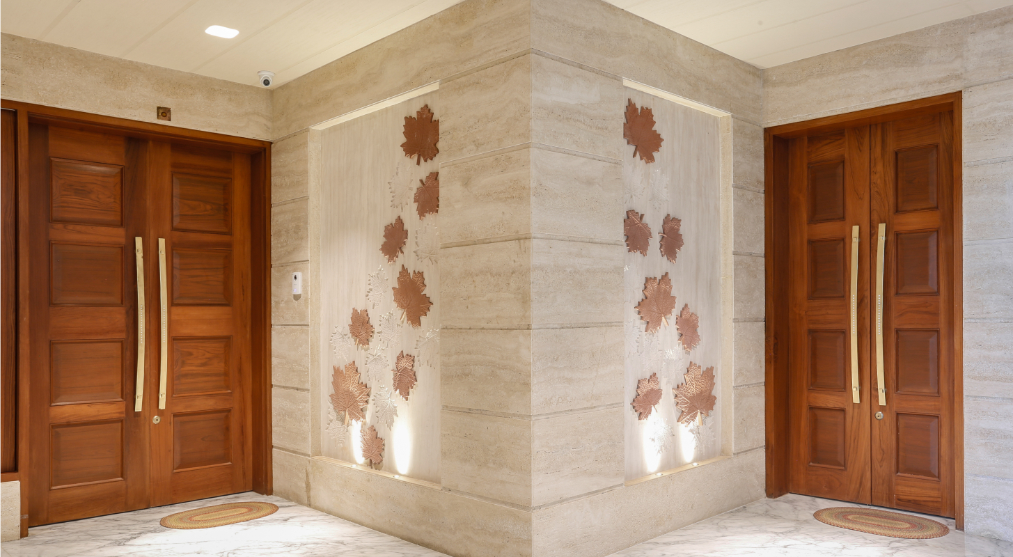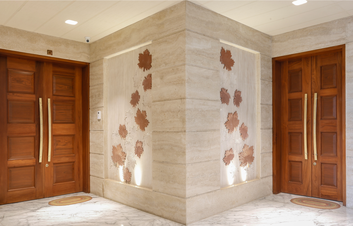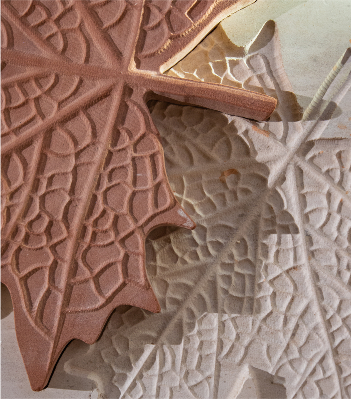 Mapple Leaf Installation at Entrance Lobby for a Private Farmhouse. Intricate leaves have been engraved in Beige Limestone with Red Sandstone leaf inserts.