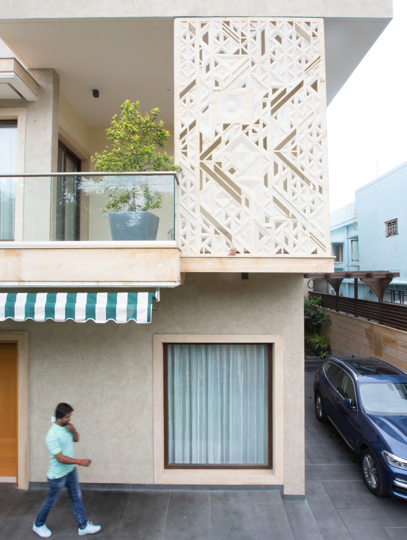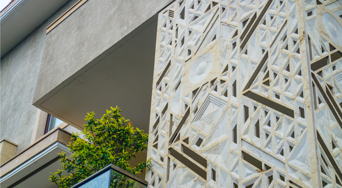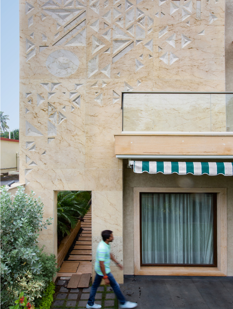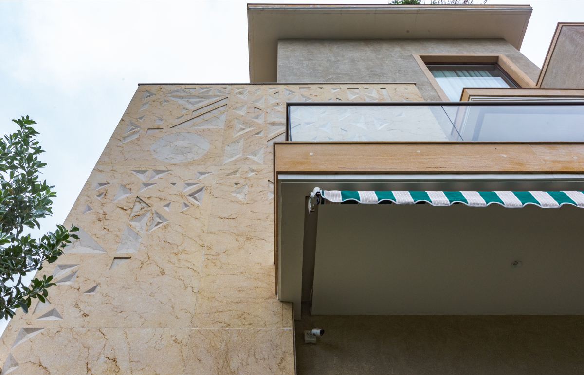 The Raza explores the conception of a litany of patterns, visualized in geometric motifs. The term ‘Raza’ comes from the Sanskrit word for ‘angle.’ Interesting patterns created from intersecting straight lines fabricate an array of forms, such as triangles, parallelograms, trapeziums, and pyramids which create a dynamic play of depth, texture, and dimensionality. For this installation, the Raza manifests itself as a combination of two permutations: a mural and a jaali screen on the facade. Varying in scale and design, the pattern has been expressed in two different tones on the same elevation. The Raza pattern exhibits itself as a jaali wrapping around the balcony of the house, crafted through the combined precision of digital fabrication and hand craftsmanship. The perforations of the jaali filer the light inside and provide a semblance of privacy, whilst creating an interesting play of light and shadow. The mural panel on the face is of a much larger scale as compared to the jaali, with the Raza pattern intricately engraved in Cecilia Gold Limestone. A circular module with a 7 foot diameter and carved in 75mm-thick stone has been introduced amidst rectangular modules carved in 30mm-thick stone cut along the edges to flawlessly integrate with the other pieces. The panels in Graphite Grey Granite have been cut along the lines of the pattern and seamlessly come together through interlocking joints.