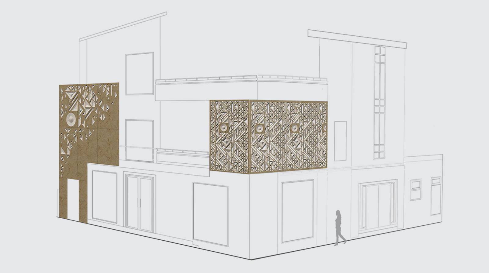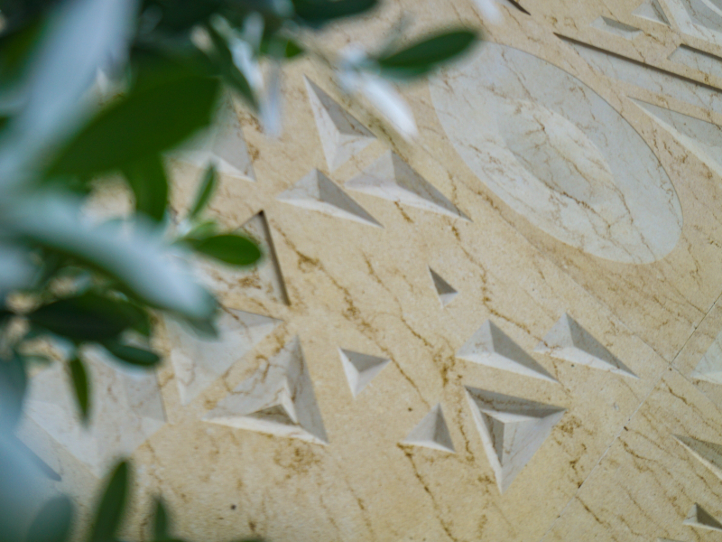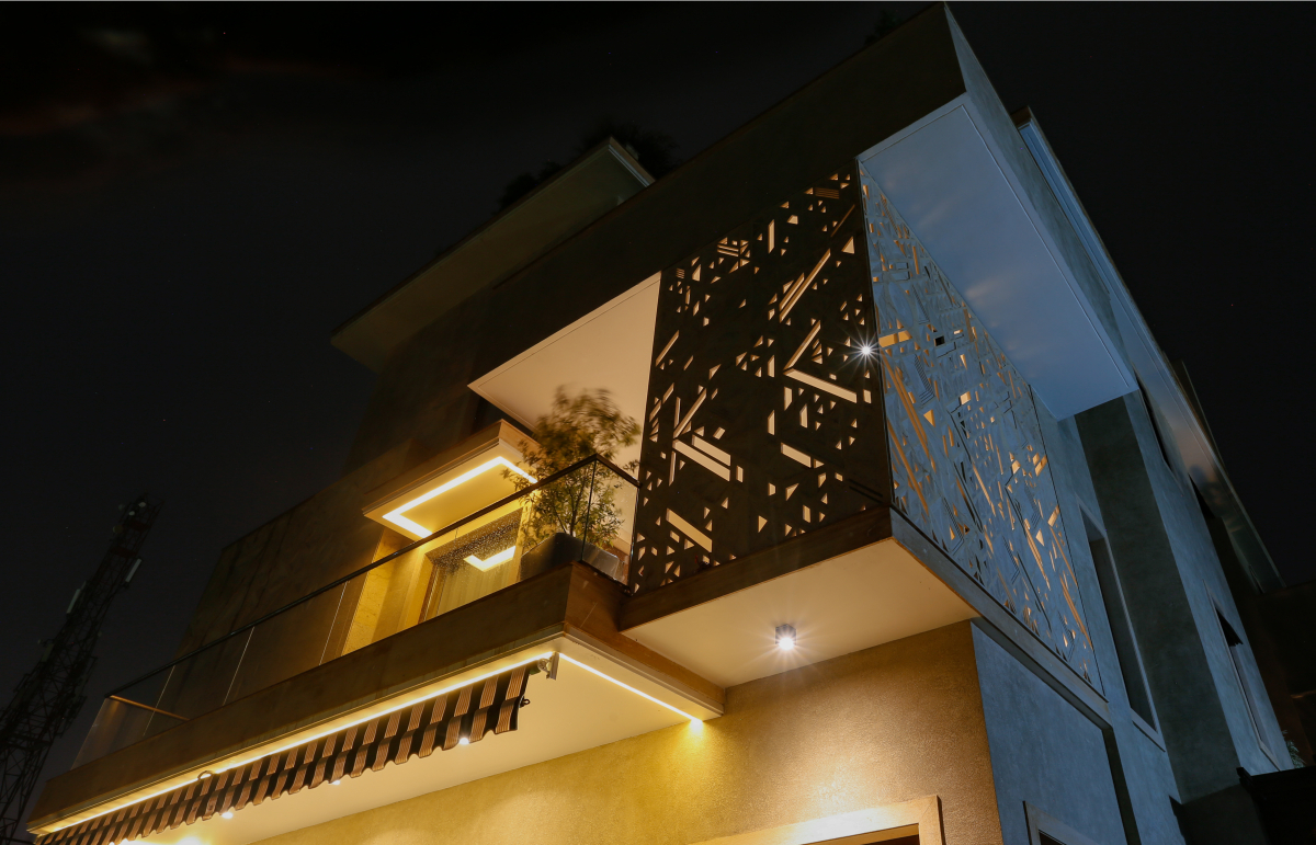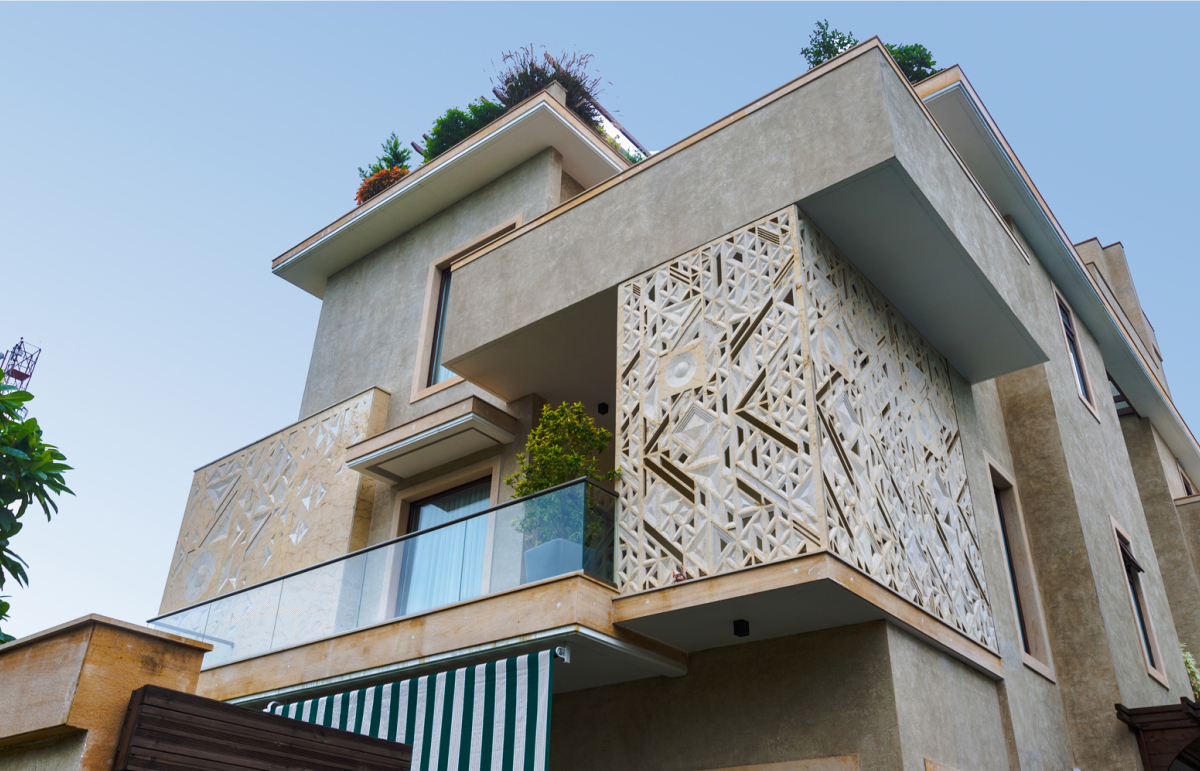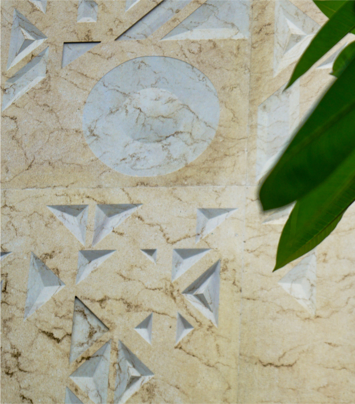 The Raza explores the conception of a litany of patterns, visualized in geometric motifs. The term ‘Raza’ comes from the Sanskrit word for ‘angle.’ Interesting patterns created from intersecting straight lines fabricate an array of forms, such as triangles, parallelograms, trapeziums, and pyramids which create a dynamic play of depth, texture, and dimensionality. For this installation, the Raza manifests itself as a combination of two permutations: a mural and a jaali screen on the facade. Varying in scale and design, the pattern has been expressed in two different tones on the same elevation. The Raza pattern exhibits itself as a jaali wrapping around the balcony of the house, crafted through the combined precision of digital fabrication and hand craftsmanship. The perforations of the jaali filer the light inside and provide a semblance of privacy, whilst creating an interesting play of light and shadow. The mural panel on the face is of a much larger scale as compared to the jaali, with the Raza pattern intricately engraved in Cecilia Gold Limestone. A circular module with a 7 foot diameter and carved in 75mm-thick stone has been introduced amidst rectangular modules carved in 30mm-thick stone cut along the edges to flawlessly integrate with the other pieces. The panels in Graphite Grey Granite have been cut along the lines of the pattern and seamlessly come together through interlocking joints.