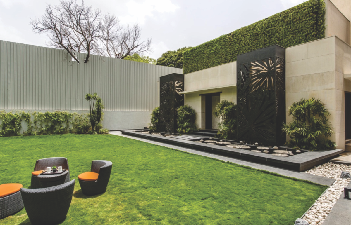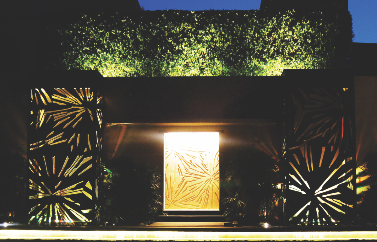 Lotus vein inspired back lit lattice, on either side of the engraved panel, and flanked by Lotus sculptures and leaves at the base, create a unique installation at a private residence in New Delhi. The imposing lattice panels in absolute black granite stand at 5 metres tall with a sculptural water body at the base. The lotus sculptures and leaves are hand carved in white marble.