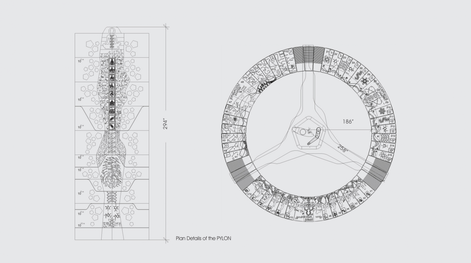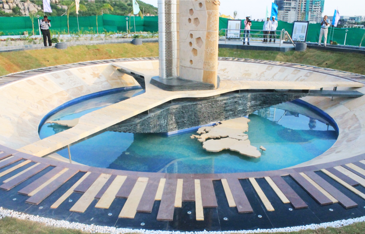 The base of the Pylon is composed of concentric circles representing nature’s five elements - Earth (Prithivi), Air (Vayu), Water (Jala), Fire (Agni) and Ether (Akasha). 160 tonnes of stone was processed in New Delhi and installed in Hyderbad in 40 days.