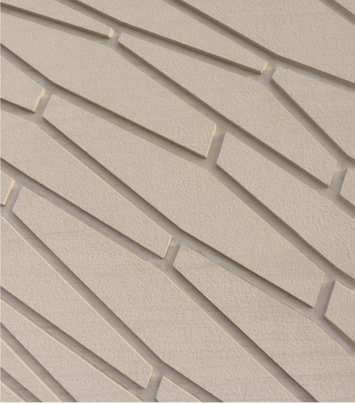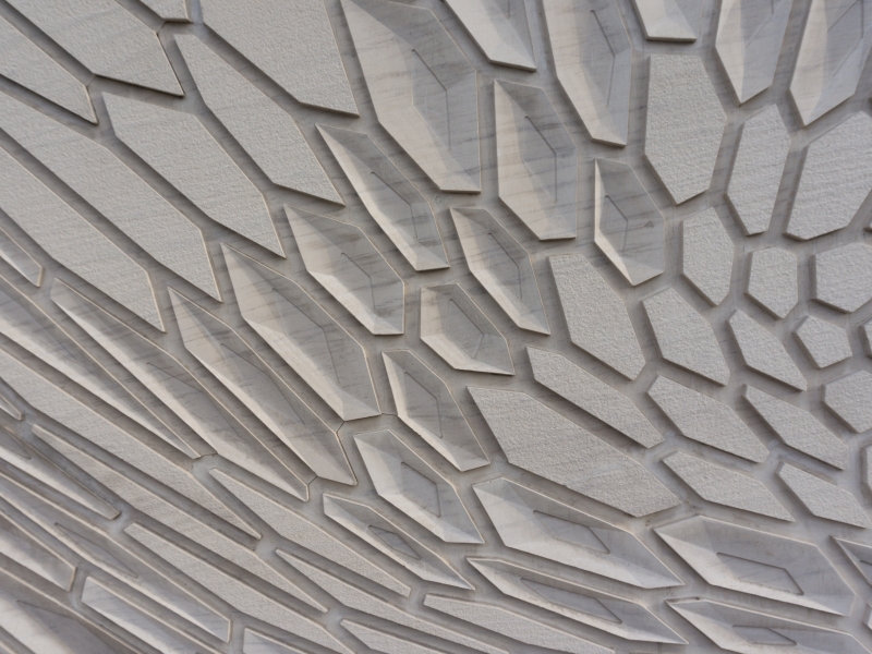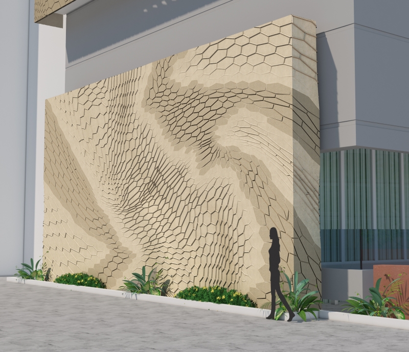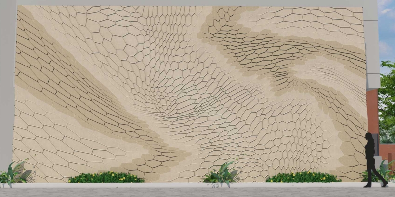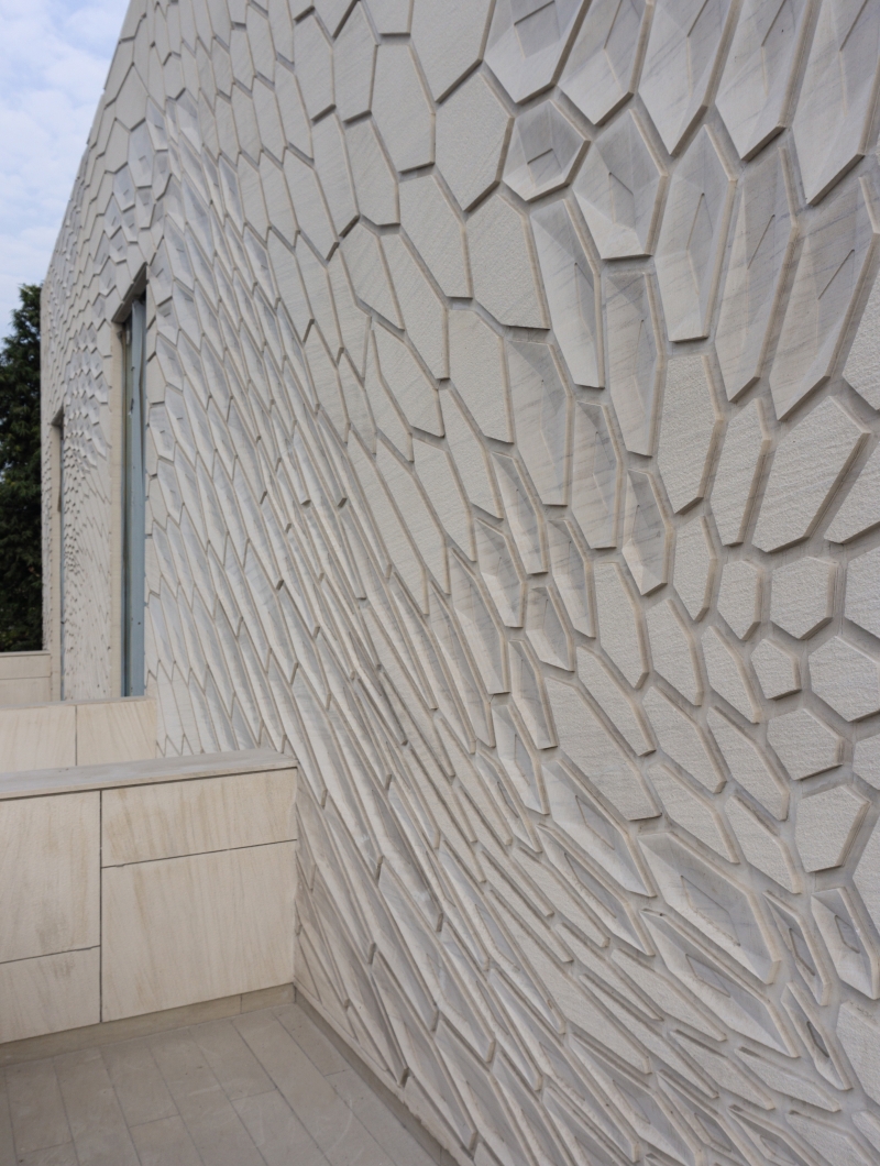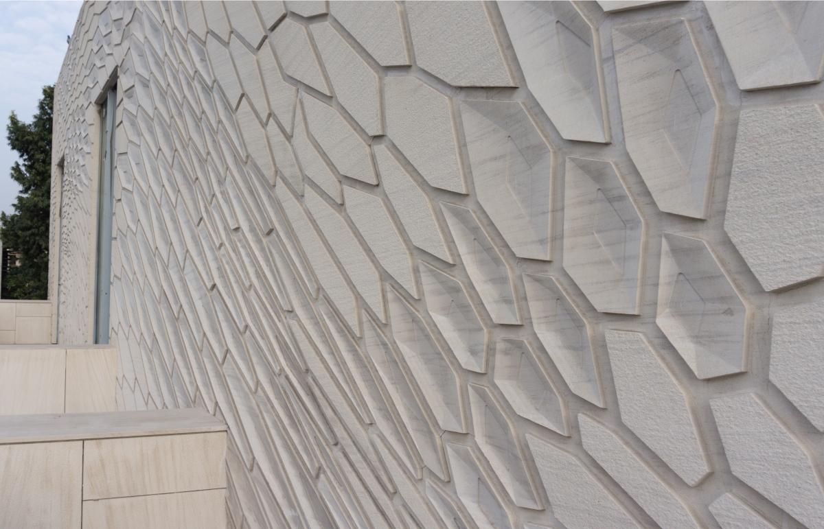 The facade of this private residence was conceptualised as a sculptural installation along with the architect, Dinesh Panwar from Urbanscape Architects. A simple hexagonal mesh is spread across as a mesh across the entire skin of the building, stretching it across the planes and incorporating movement though the carved interpretations of lattice work, engraving and embossing. No two modules of the building are the same and all the panels are carved with interlocking joints, making the entire skin a massive jigsaw puzzle.