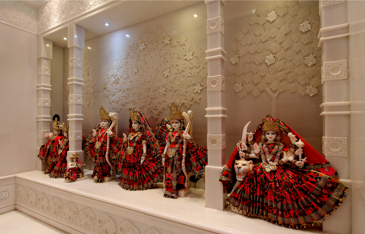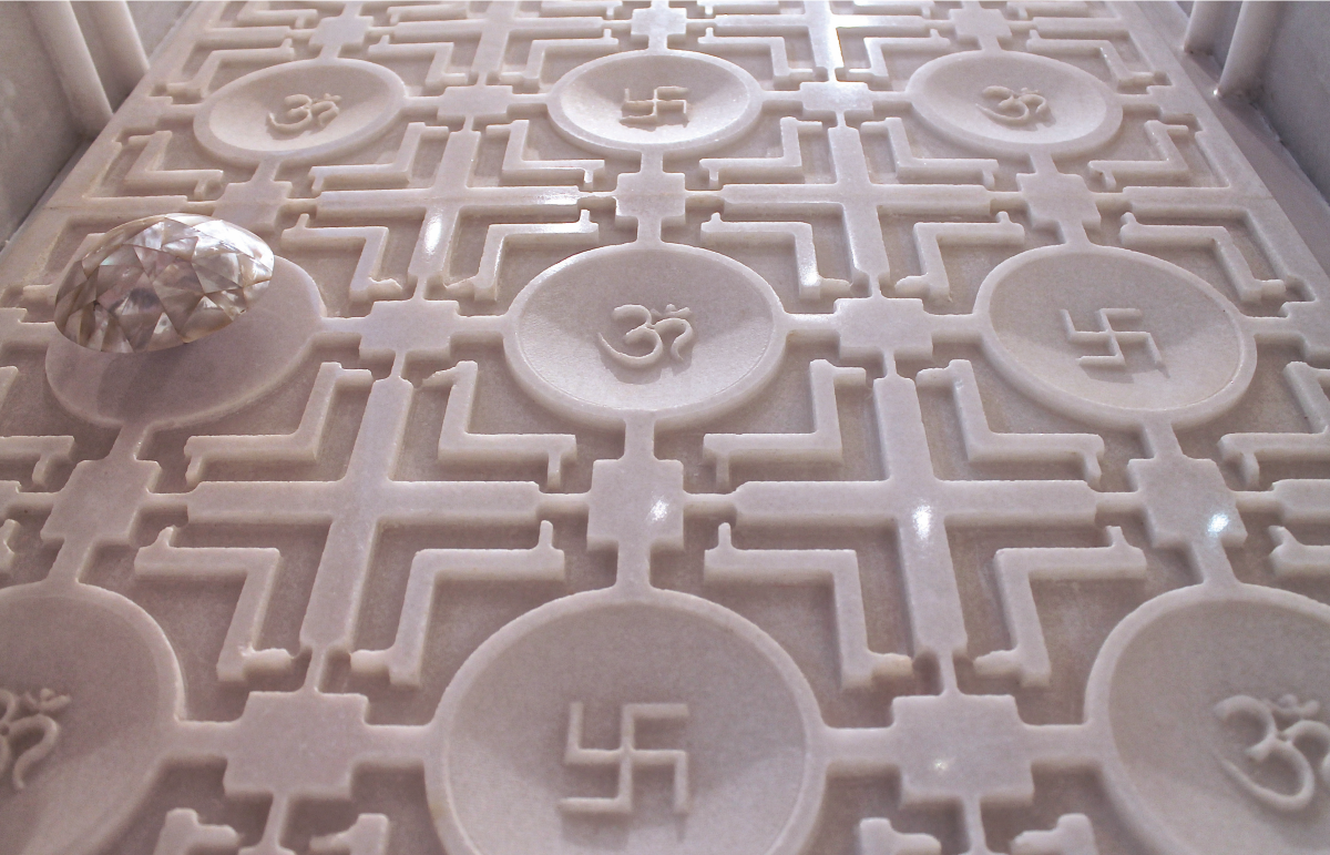 Intricate carving in white marble with subtle inlays of mother-of-pearl and some gemstones, make the idols stand out in this pristine space.