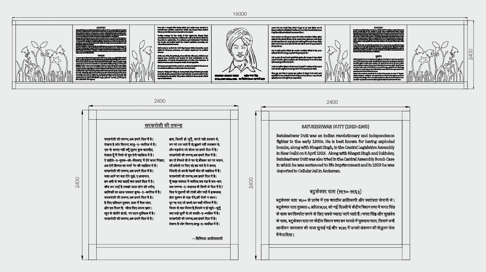 The memorial has information about Bhagat Singh’s sacrifice dedicated as an explanatory mural with illustrations, carved in Agra red sandstone and Gwalior white sandstone. The decorative Agra sandstone makes it easier to read from 1-2 feet from the foot of the memorial. Agra Red Sandstone is an inherent part of the architecture in India and has been used for centuries for prolific monuments and buildings. It ages gracefully and responds well to wear and tear and weathering over the years. The color red is also symbolic of Shaheed Bhagat Singh’s resolve to attain freedom from 200 years of British rule.